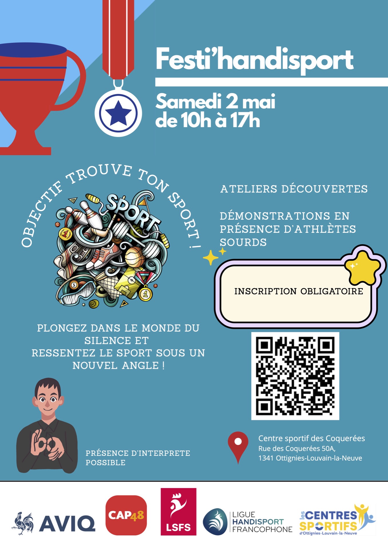 Cette journée de découverte sportive se déroulera dans les installations sportives du Centre Sportif des Coquereés, Rue des Coquerées, 50A à 1341 Ottignies Louvain-la-Neuve .